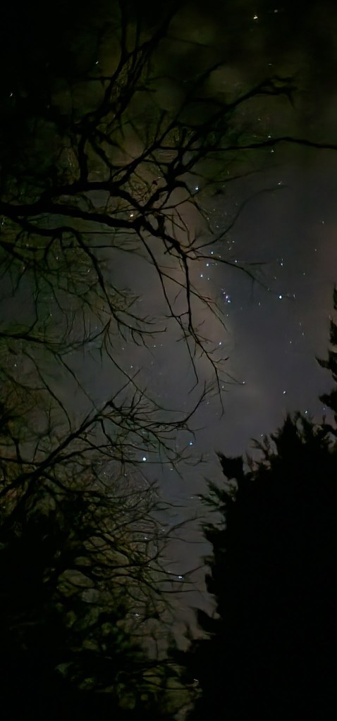 The wind in the trees, and nocturnal creatures making their presence known, have always been a “balm to my soul.” My eyes are drawn to the night sky. On clear, cold, moonless nights the stars truly do sparkle like diamonds on black velvet. I invariably search for familiar constellations, while contemplating the Creator of that vast universe. From as far back as I can remember, He has always been an enigma to me.